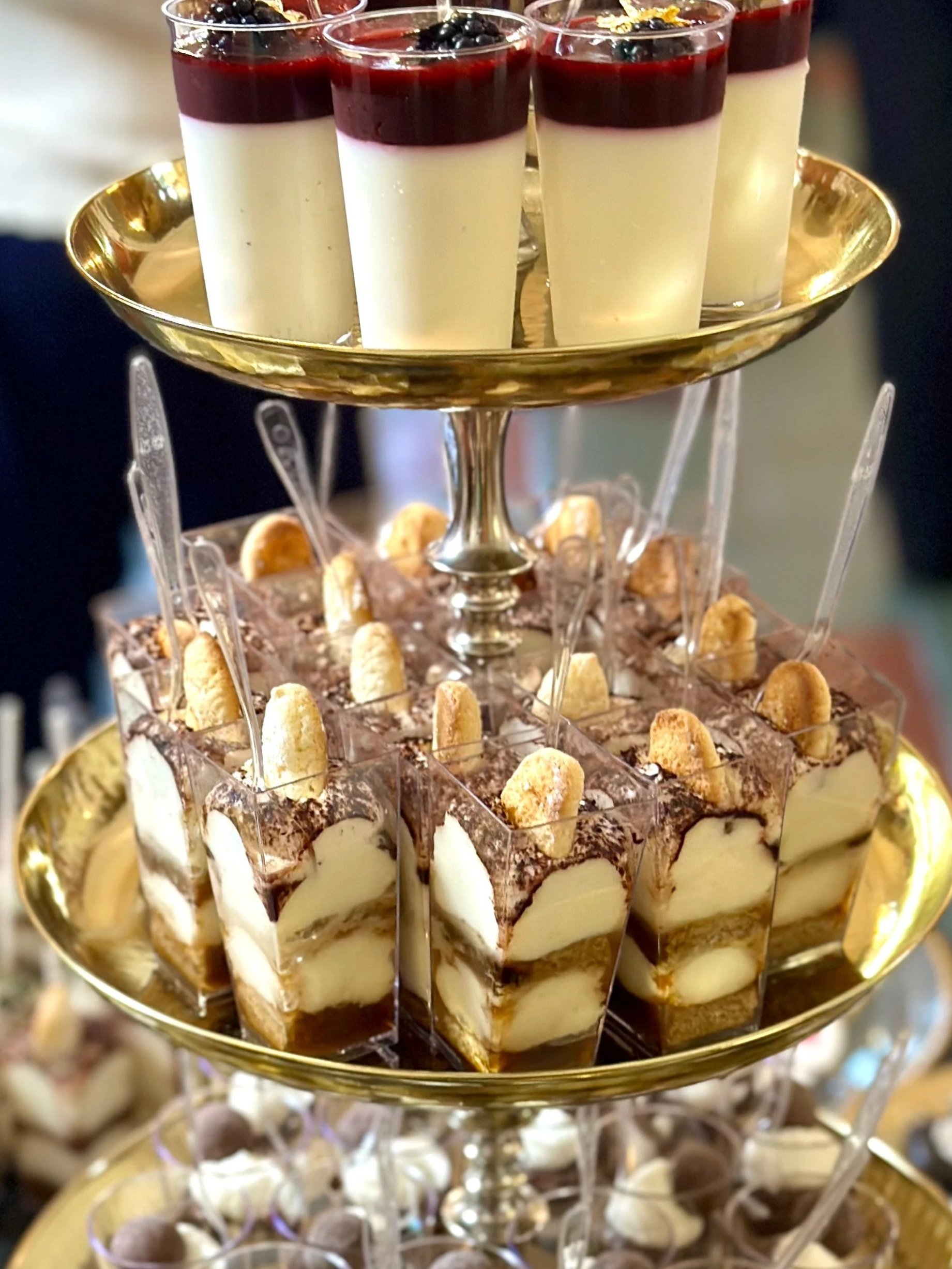 Classic Italian tiramisu reimagined in individual servings–layers of espresso soaked ladyfingers and airy mascarpone cream, dusted with cocoa for an elegant finish.